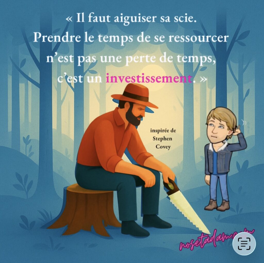Apprenons donc à marquer des respirations. Car c’est souvent dans le silence entre deux notes que la musique retrouve toute sa beauté et comme le dit si bien Stephen Covey, dans Les 7 habitudes de ceux qui réalisent tout ce qu’ils entreprennent, apprenons à prendre soin à aiguiser notre scie pour qu’elle coupe longtemps et toujours avec la même vigueur.